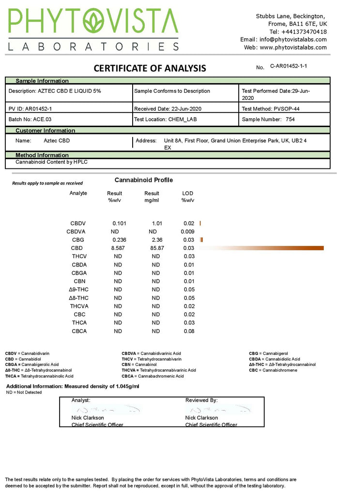 CBD (cannabidiol) is an active substance found in hemp oil. It is perfectly legal and safe to use. CBD has no side effects and is not addictive. Aztec CBD e liquid is non-psychoactive and the content of THC is tested on every batch to meet specification requirements of less than 0.05%.